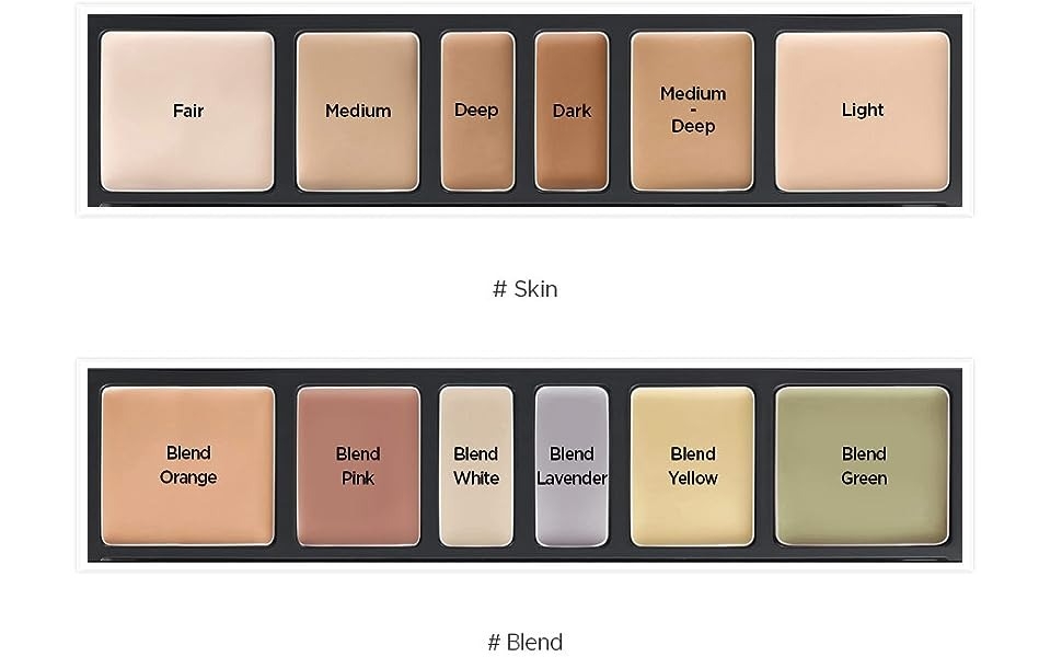 – BLEND : Gồm các màu sắc để trung hòa da Blend Orange, Blend Pink, Blend White, Blend Lavender, Blend Yellow, Blend Green. Dùng để che các vùng bị vết đỏ như nổi mẩn, lộ mạch máu; khu vực rãnh cười, chân chim khóe mắt.Phù hợp với da nhiều khuyết điểm về sắc tố và AC.NE.