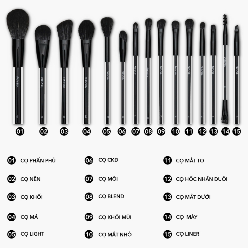 Tên sản phẩm: [Bộ cọ MUA.s Silk 15 cây] Bộ Cọ MUA.s Silk 15 Cây Đen Kèm Túi Chất Lông Mền Mịn Bộ Cọ Trang Điểm Chuyên Nghiệp