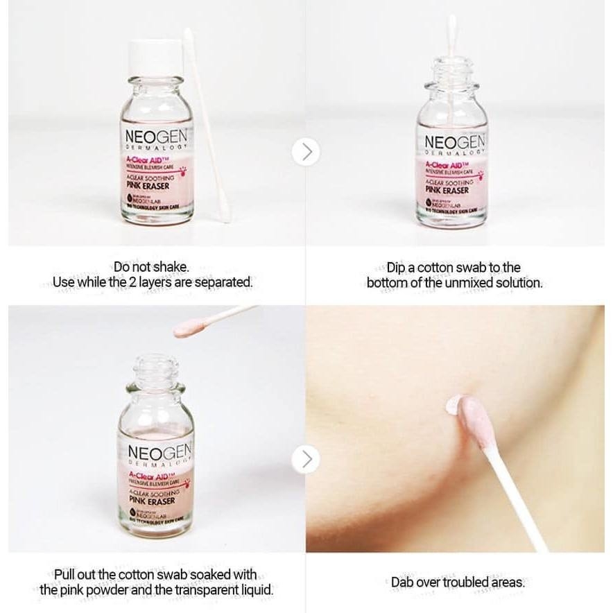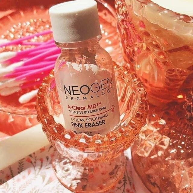 - Dung Dịch Chấm Mụn, Giảm Sưng Viêm Cấp Tốc Neogen Dermalogy A-Clear Soothing Pink Eraser với thành phần chính chứa Calamine là hợp chất giữa Sắt(III) Oxit và Kẽm Oxit có màu hồng tự nhiên thích hợp sử dụng cho da nhiều mụn trứng cá, mụn sưng đỏ với khả năng tiêu viêm và gom còi mụn nhanh chóng