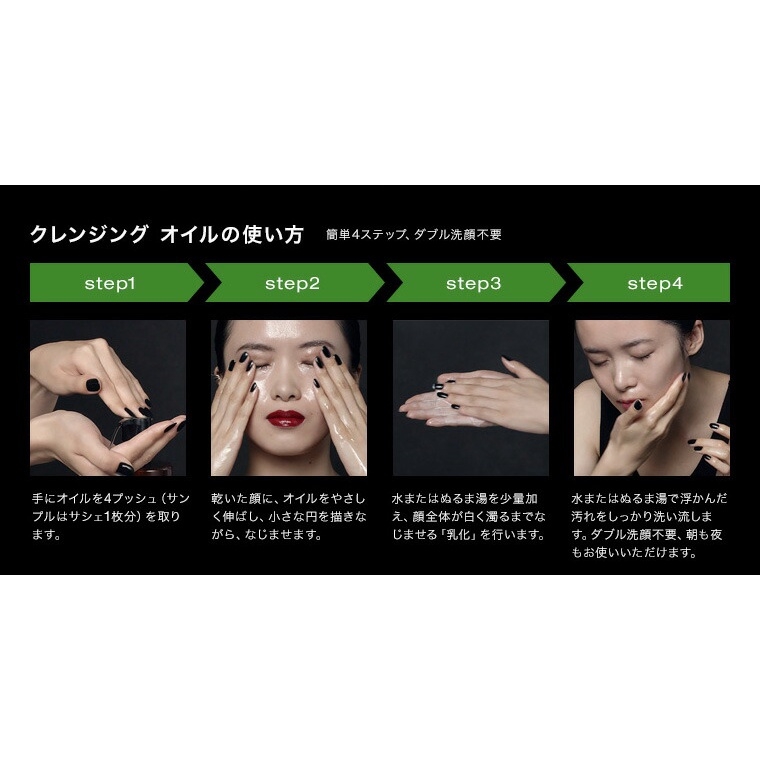 Giữ mặt và tay khô, đổ dầu tẩy trang ra tay, sau đó mát-xa trên từng vùng của khuôn mặt trong khoảng 1 phút rồi thêm chút nước ấm để nhũ hóa. Rửa sạch mặt bằng nước ấm.