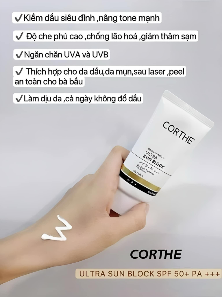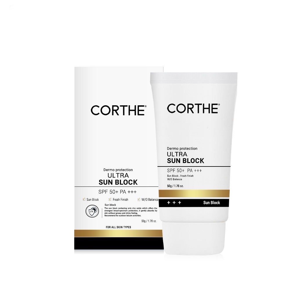Corthe Dermo Protection Ultra Sun Block có kết cấu dạng kem, trắng mịn, không gây bết dính, bóng dầu, không để lại vệt trắng trên da. Đây là sản phẩm chống nắng đa công dụng, có thể kể đến như chống nắng, dưỡng trắng da, giảm mụn, thu nhỏ lỗ chân lông, đẩy nhanh quá trình làm lành vết thương trên da. Kem Chống Nắng Corthe chứa các thành phần lành tính, an toàn cho da, không gây kích ứng, phù hợp với mọi làn da, đặc biệt là da dầu, da mụn, da nhạy cảm, da vừa trải qua điều trị laser, peel,...