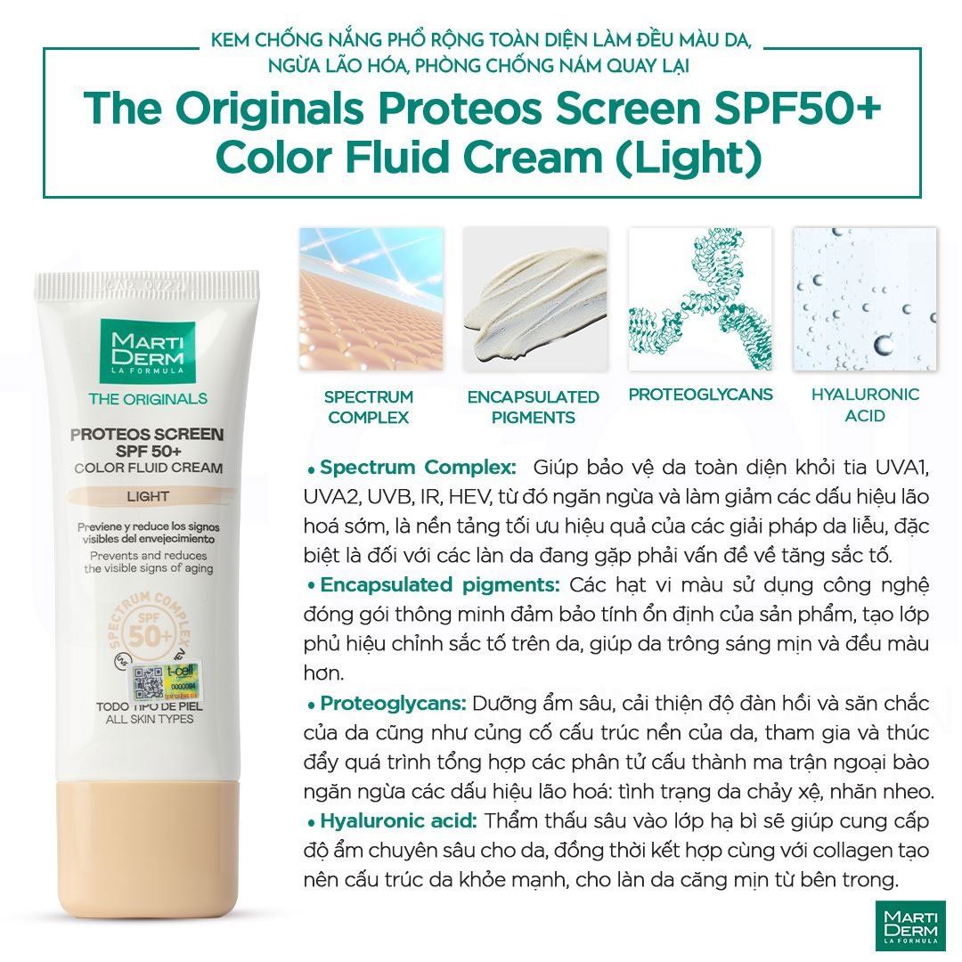 Proteos Screen SPF 50+ Color Fluid Cream (Light) là phiên bản kem chống nắng chứa các hạt vi màu hiệu chỉnh sắc tố da giúp làm sáng và đều màu da tức thì. Công thức chứa các thành phần tiên tiến và vượt trội, không chỉ cung cấp màng lọc chống lại tia UVA/UVB/IR/HEV (ánh sáng xanh), bảo vệ da khỏi các tổn thương bởi ánh nắng mặt trời mà còn giúp thay thế lớp trang điểm, che phủ các khuyết điểm trên da như thâm mụn, da xỉn màu, mang lại da hồng hào, rạng rỡ ngay khi sử dụng. Sự kết hợp của Proteoglycans, Hyaluronic Acid, phức hợp Spectrum Complex, giúp giữ cho làn da căng mịn, tươi trẻ. Kết cấu dạng cream-to-powder độc đáo mang lại cảm giác mượt mà, mỏng nhẹ, lý tưởng dành cho mọi loại da. Trong đó: