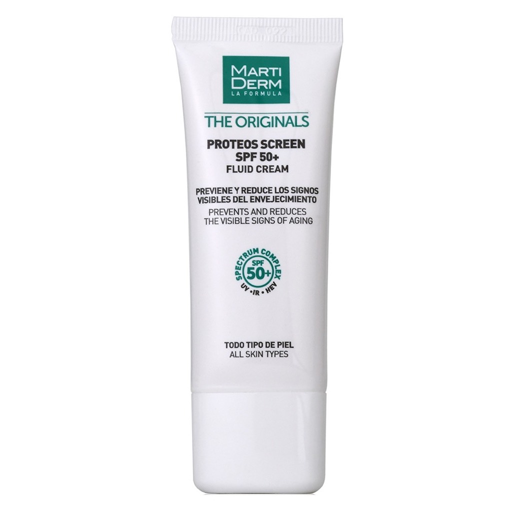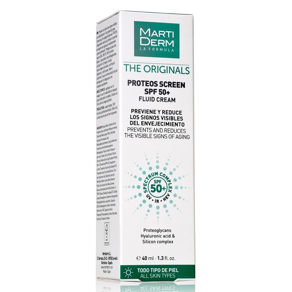 Dòng kem chống nắng MartiDerm The Originals Proteos Screen SPF50+ Fluid Cream là một sản phẩm chống nắngđến từ thương hiệu dược mỹ phẩm MartiDerm của Tây Ban Nha. Thương hiệu này được thành lập bởi bác sĩ Marti To – người tiên phong nghiên cứu và sản xuất những sản phẩm làm đẹp hiệu quả và an toàn cho làn da. Với chỉ số SPF 50+ giúp ngăn ngừa và sửa chữa các dấu hiệu lão hoá da sớm kết hợp màng lọc chống nắng phổ rộng chống lại các tia UVA, UVB, IR (hồng ngoại), HEV (ánh sáng xanh). Các thành phần khác như Proteoglycans, Spectrum Complex và Hyaluronic Acid & Silicon Complex giúp da chống lại với ánh nắng mặt trời, giúp da luôn duy trì được sự trẻ trung và khỏe mạnh, mang lại cảm giác mượt mà, mỏng nhẹ tựa “vô hình” trên da.
