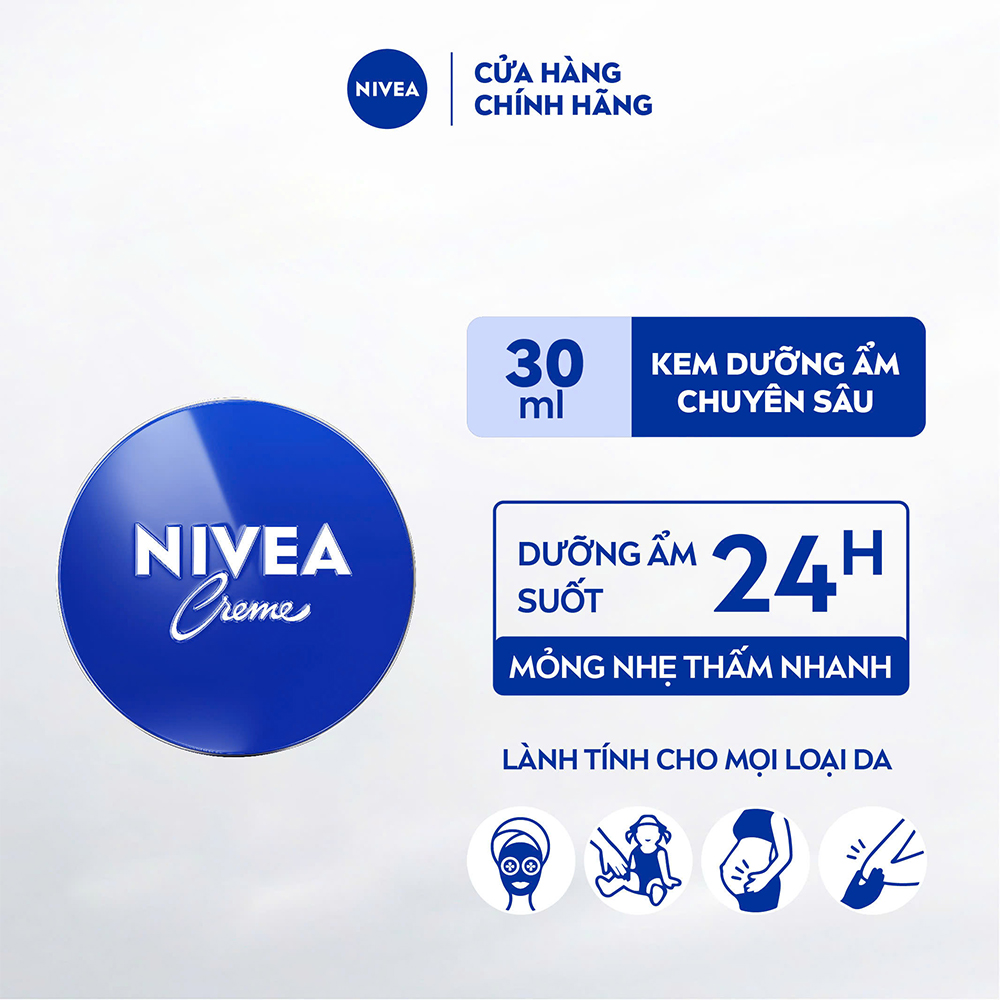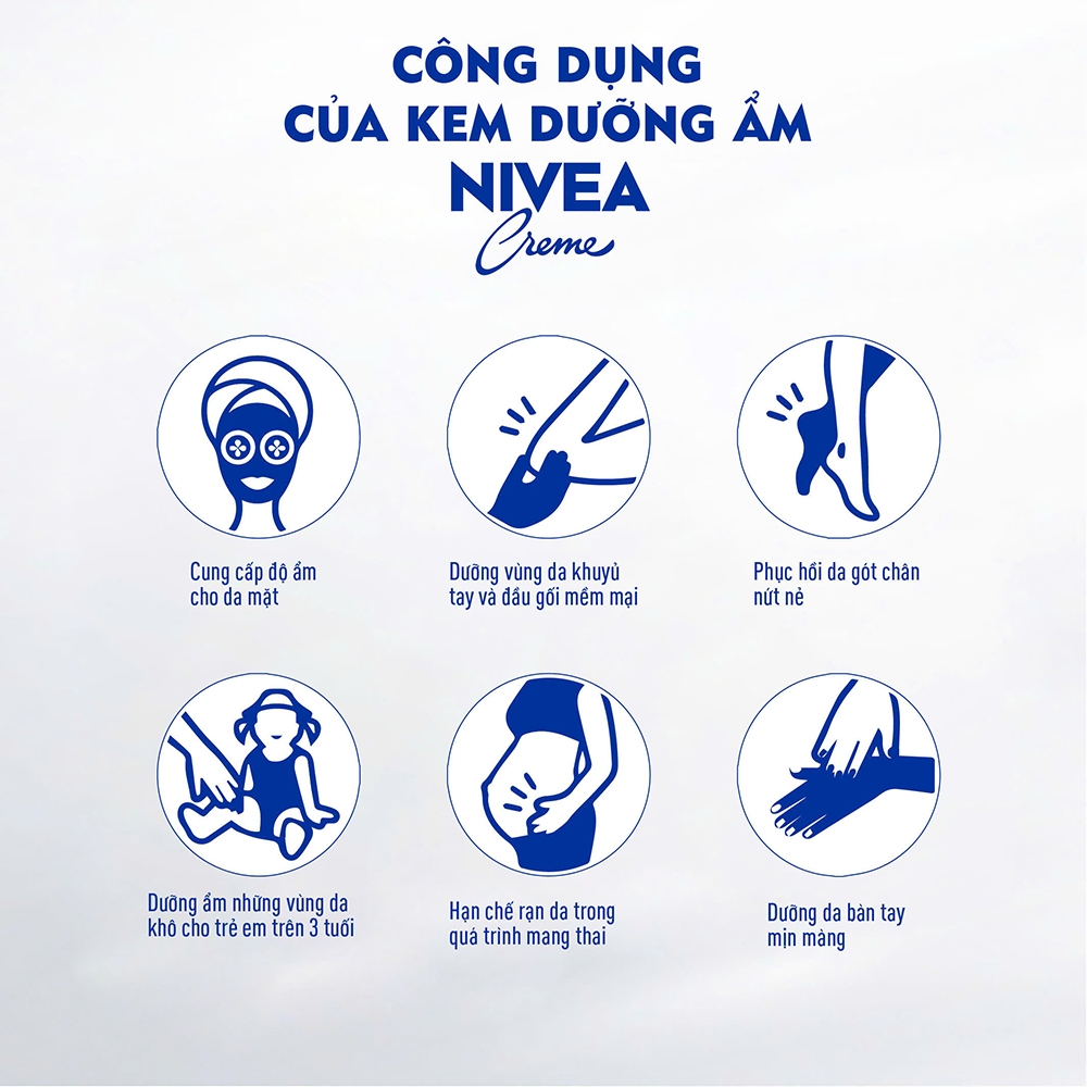 Kem Dưỡng Ẩm Hỗ Trợ Da Sáng Mịn Nivea Creme thuộc dòng kem dưỡng chăm sóc da mặt và cơ thể đến từ thương hiệu Nivea với chiết xuất từ sữa và hoạt chất Eucerit giúp dưỡng ẩm sâu, bổ sung độ ẩm suốt 24 giờ, bảo vệ và nuôi dưỡng làn da mịn màng, đặc biệt những vùng da khô ráp và da bụng của phụ nữ mang thai hay mới sinh. Kem dưỡng lành tính nên an toàn với mọi loại da, kể cả làn da trẻ em.
