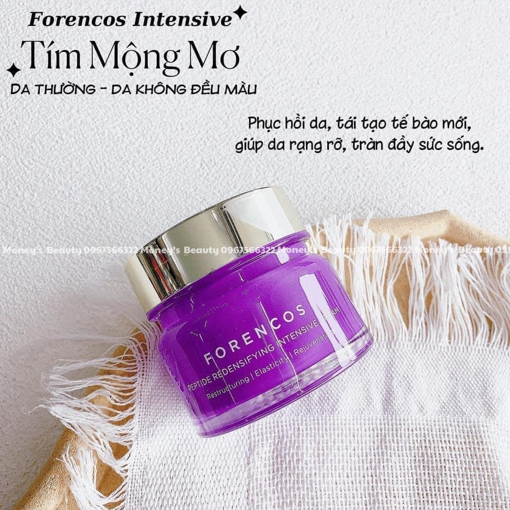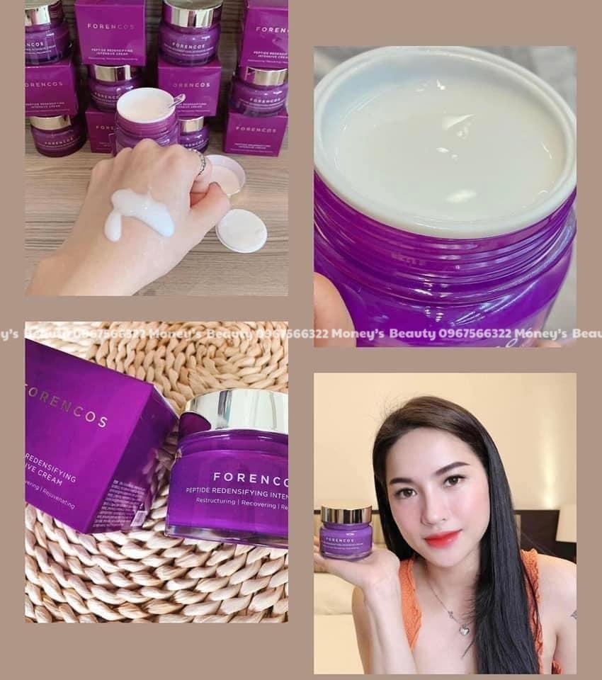 - Kem Dưỡng Trắng Da Ban Đêm Forencos Peptide Redensifying Intensive Cream Với thành phần Peptide 14% giúp tăng cường sự đàn hồi cho da, hạn chế các tình trạng nổi mẩn đỏ trên da, làm dịu da, làm chậm quá trình lão hóa trên da và làm mờ các vết thâm nám hiệu quả.