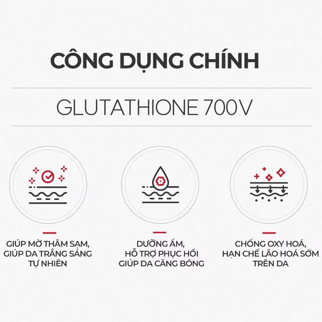 - Nano L-Glutathione 700mg: Công nghệ Liposome giúp tăng cường việc thẩm thấu của các hoạt chất nano L-Glutathione - dạng khử hoạt động của Glutathione vào sâu bên trong da thúc đẩy chống oxy hóa, chống lão hóa, hình thành các sắc tố sáng & ức chế tạo hắc sắc tố để làm trắng sáng da từ bên trong.