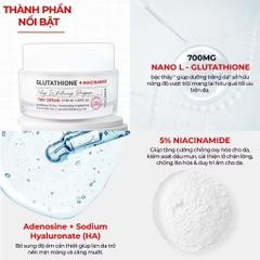 Water, Caprylic/Capric Triglyceride, Dipropylene Glycol, Glyceryl Stearate, Butylene Glycol, Squalane, Cetearyl Alcohol, Cetyl Ethylhexanoate, Simmondsia Chinensis (Jojoba) Seed Oil, Niacinamide, 1,2-Hexanediol, Glyceryl Stearate, PEG-100 Stearate, Cetearyl Olivate (dầu olive), Sorbitan Olivate, Betaine, Macadamia Ternifolia Seed oil (hạt Macca), Glutathione, Sodium Hyaluronate, Arginine, Panthenol, Allantoin, Adenosine, Tocopheryl Acetate (Vitamin E bậc cao), Dipotassium Glycyrrhizate, Carbomer, Dipotassium EDTA, Dimethicone.