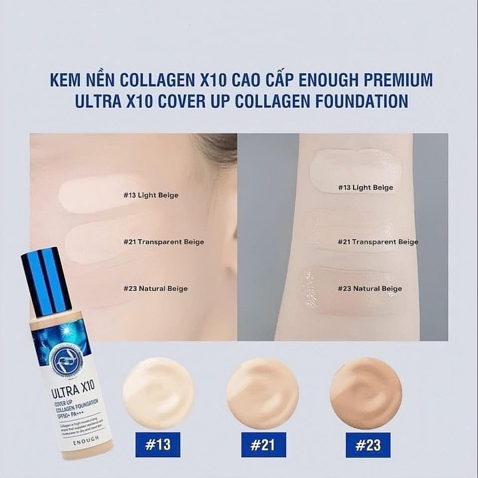 Kem Nền Enough Premium Ultra X10 Cover Up Collagen Foundation 100ML có 3 tông màu là 13, 21, 23. Mỗi tông màu sẽ phù hợp với từng loại da khác nhau.