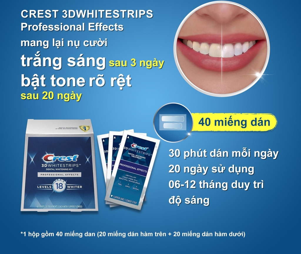 - Để đạt hiệu quả làm trắng tốt hơn, khuyên dùng đủ liệu trình 7 ngày, 14 ngày, 21 ngày kết hợp kem đánh răng Crest tuỳ thuộc từng tình trạng răng.
