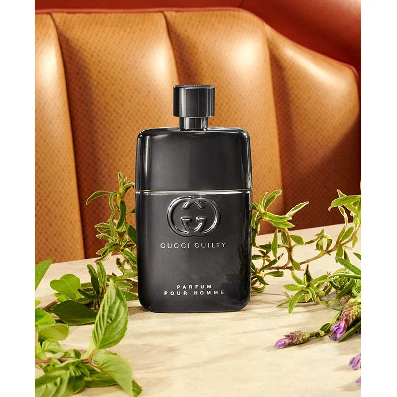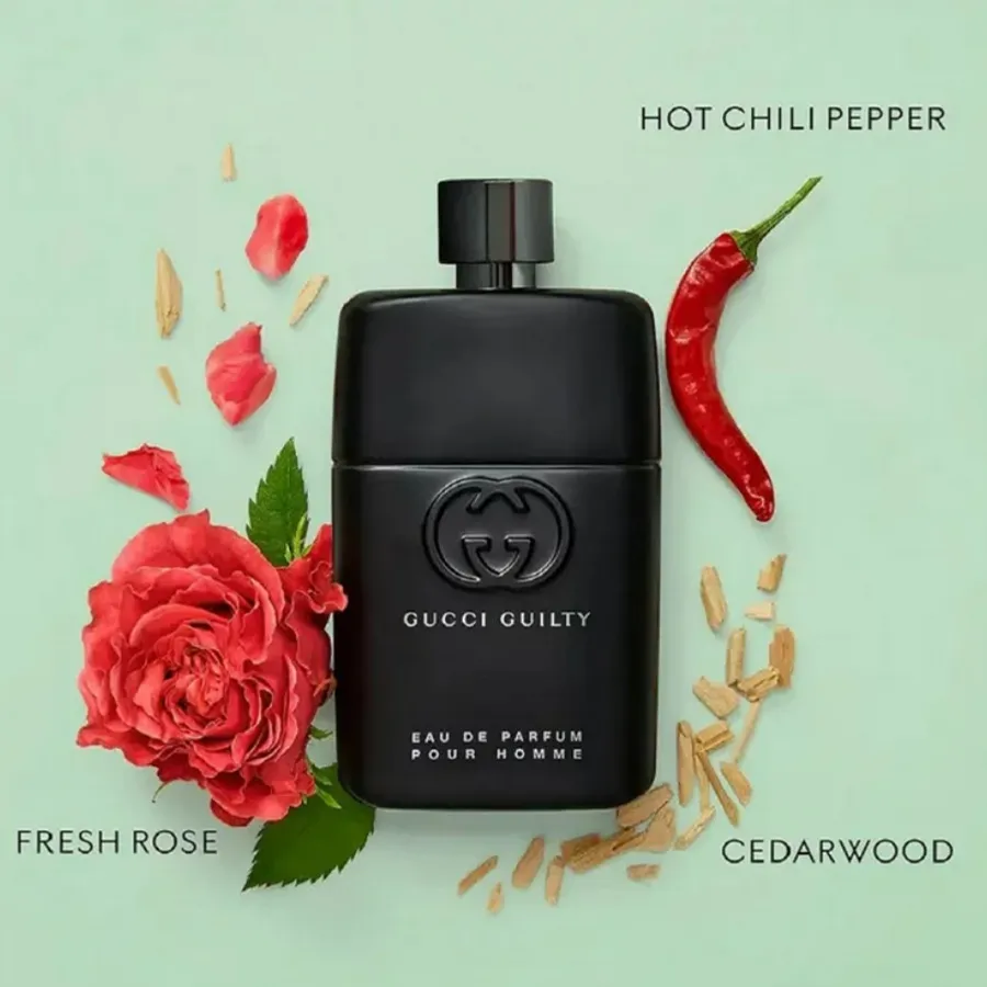 Hồng và Gia vị nhảy múa khá lâu trong khứu giác của chúng ta, quyến luyến và day dứt, để rồi được làm dịu dàng và trầm lắng trở lại bằng những mùi hương quen thuộc trong mỗi chai nước hoa nam, những Hoa cam, hay Oải hương. DNA của Gucci Guilty dần dần hiện trở lại rõ ràng, bằng hương Gỗ tuyết tùng, tạo nên một tấm nền vững chắc, mạnh mẽ và đầy lôi cuốn cho Gucci Guilty Pour Homme Eau de Parfum.