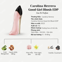 Carolina Herrera Good Girl Blush đáng yêu như đôi má hồng của người thiếu nữ. Có một chút e thẹn và dễ thương từ Hoa mẫu đơn dịu dàng, có một chút rạng rời từ Cam bergamot tươi sáng, và cũng có một chút ngọt ngào từ Vanilla bông mịn. Tất cả những nét hương mềm mại và ấm áp đó đã tạo nên vẻ đẹp của người phụ nữ đáng yêu đầy nữ tính của nhà Carolina Herrera.