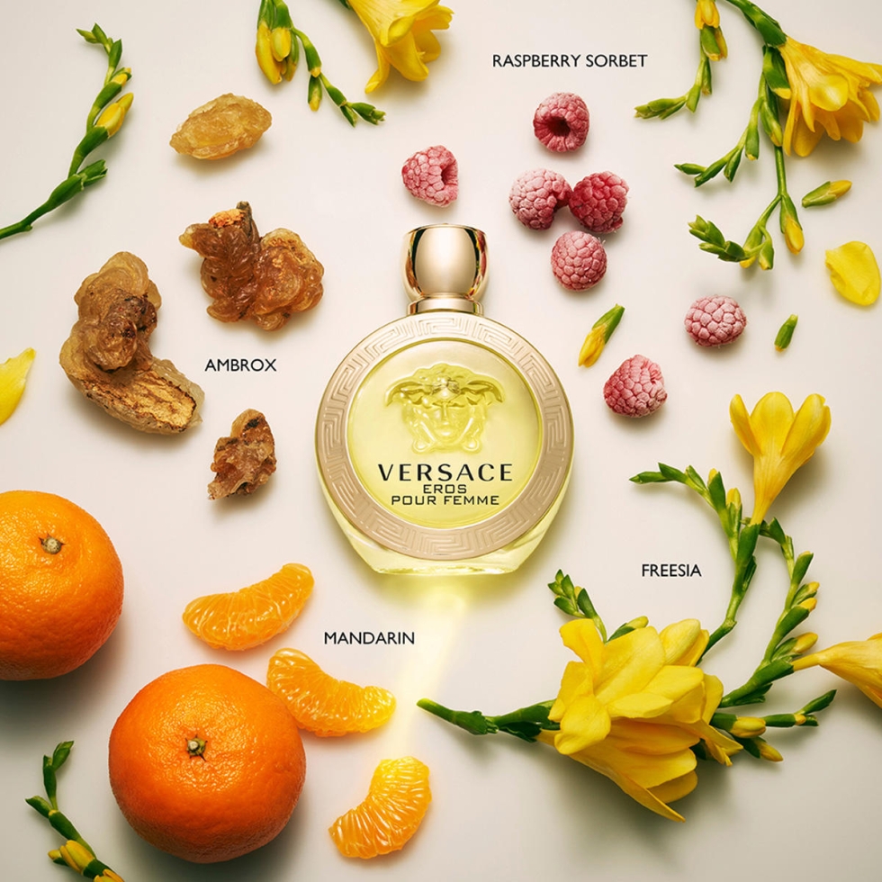 Versace Eros Pour Femme khởi đầu với sự kết hợp đầy năng lượng của Chanh, Cam Bergamot và Lựu. Dần dà, chúng lại tránh đi, nhường chỗ cho hương Hoa toả nét nồng nàn, nữ tính đầy lôi cuốn. Chốt lại chuỗi hương hấp dẫn ấy là cái ôm đầy ấm áp của Gỗ đàn hương, Xạ hương và Hương Ambroxan, như một hiệu ứng nền làm tăng lên sự bí ẩn, quyến rũ của người phụ nữ.
