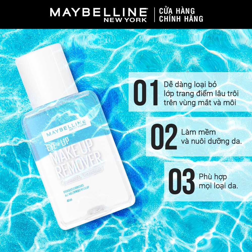Nước Tẩy Trang Mắt Môi Maybelline thuộc dòng chăm sóc da của hãng, nếu son kem được mệnh danh là siêu lì thì nước tẩy trang được đánh giá cao bởi khả năng làm sạch, lấy đi mọi lớp trang điểm cứng đầu trên da. Đây là dung dịch tẩy trang có 2 lớp dầu và nước, lớp dầu để tẩy trang chuyên dụng còn lớp nước dùng để làm sạch và dưỡng ẩm cho da. Công thức hoàn toàn dịu nhẹ, an toàn với mọi loại da, kể cả da nhạy cảm.
