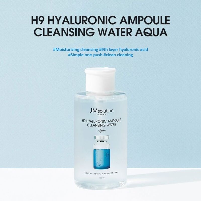 Nước Tẩy Trang JM Solution H9 Hyaluronic Ampoule Cleansing Water với 9 loại Hyaluronic Acid sẽ giúp loại bỏ lớp trang điểm, tạp chất và bụi bẩn trên da hiệu quả mà vẫn giữ được độ ẩm cho làn da mềm mại, không bị khô căng sau khi tẩy trang.