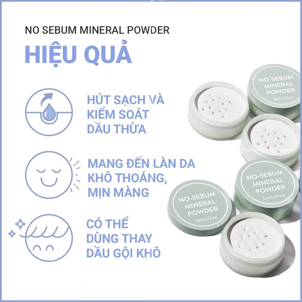 Kiểm soát dầu nhờn: Phấn phủ kiềm dầu Innisfree No sebum Mineral Powder với công thức kiểm soát dầu nhờn vượt trội, giữ được lớp makeup lâu trôi đến 24 giờ đồng hồ.
