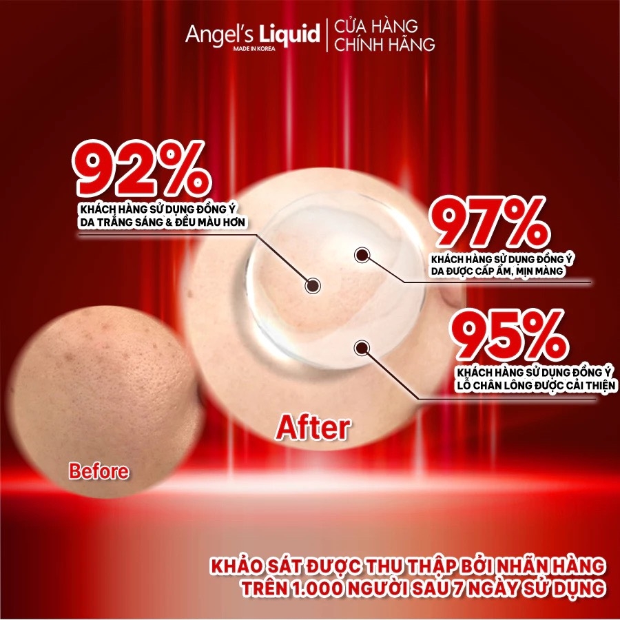 Cải thiện đốm nâu, đồi mồi: Serum Angel's Liquid Tinh chất chứa đến 700mg hoạt chất Glutathione là thành phần hỗ trợ dưỡng trắng nổi bật có khả năng ức chế Melanin được đánh giá mạnh hơn gấp 100 lần so với Vitamin C giúp hỗ trợ cải thiện đốm nâu đồi mồi, làm sáng làn da bị cháy nắng và cải thiện tình trạng nám da.