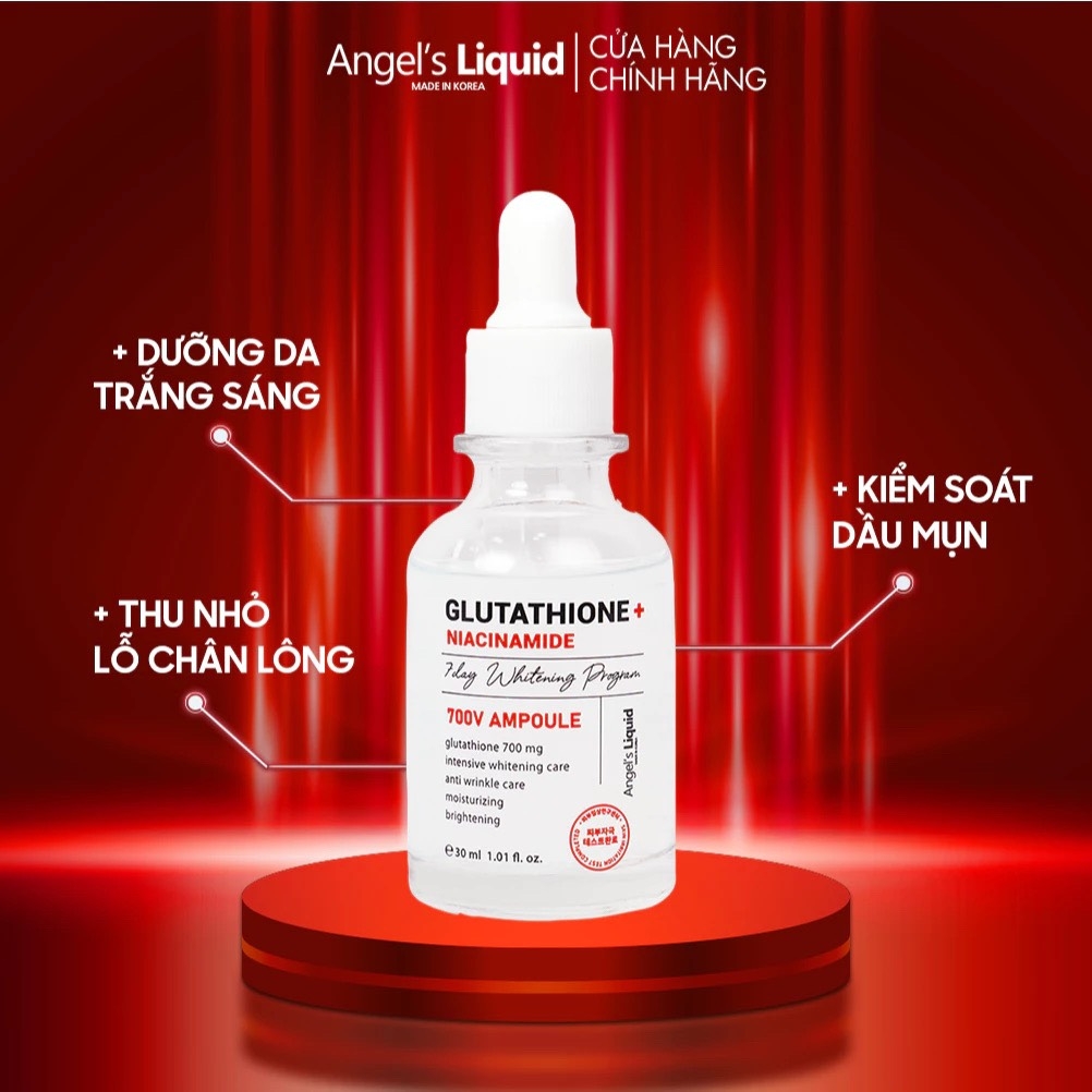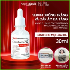 Serum Angel's Liquid Huyết Thanh Hỗ Trợ Dưỡng Trắng Da, Làm Mờ Thâm Nám Angel's Liquid Glutathione 700 V-Ampoule là tinh chất dưỡng thuộc thương hiệu mỹ phẩm Angel's Liquid, tinh chất chứa đến 700mg hoạt chất Glutathione là thành phần hỗ trợ dưỡng trắng nổi bật có khả năng ức chế Melanin được đánh giá mạnh hơn gấp 100 lần so với Vitamin C, kết hợp với thành phần Niacinamide và Adenoside giúp cải thiện nhanh chóng đốm nâu đồi mồi, làm sáng làn da bị cháy nắng và cải thiện tình trạng nám da.