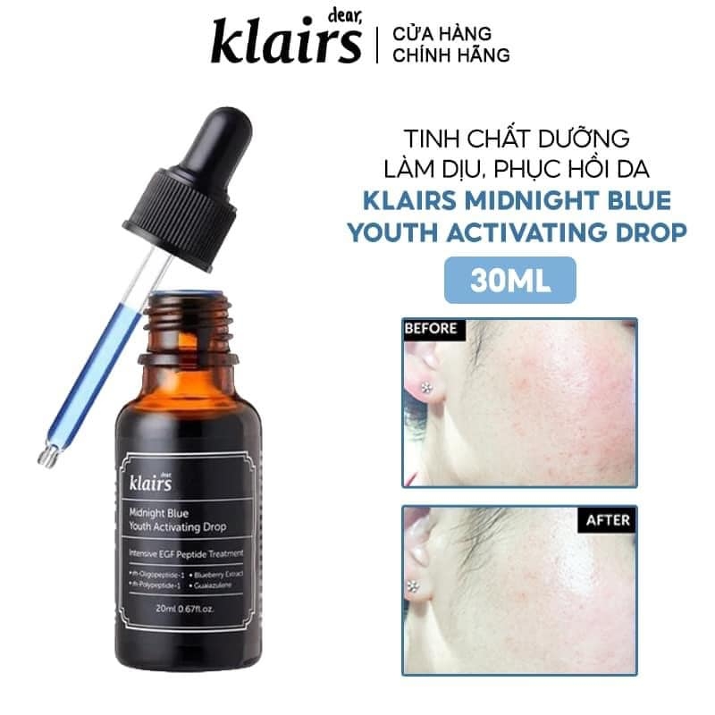 Serum Klairs Tinh Chất Dưỡng Làm Dịu, Phục Hồi Da Klairs Midnight Blue Youth Activating Drop sản phẩm được sử dụng trước khi đi ngủ, với thành phần chính là EGF (sh-Oligopeptide-1), bFGF (sh-Polypeptide-1). Đây là 2 hoạt chất do cơ thể tự sản sinh ra, giúp giữ cho da khỏe ở bên trong và đẹp từ bên ngoài.