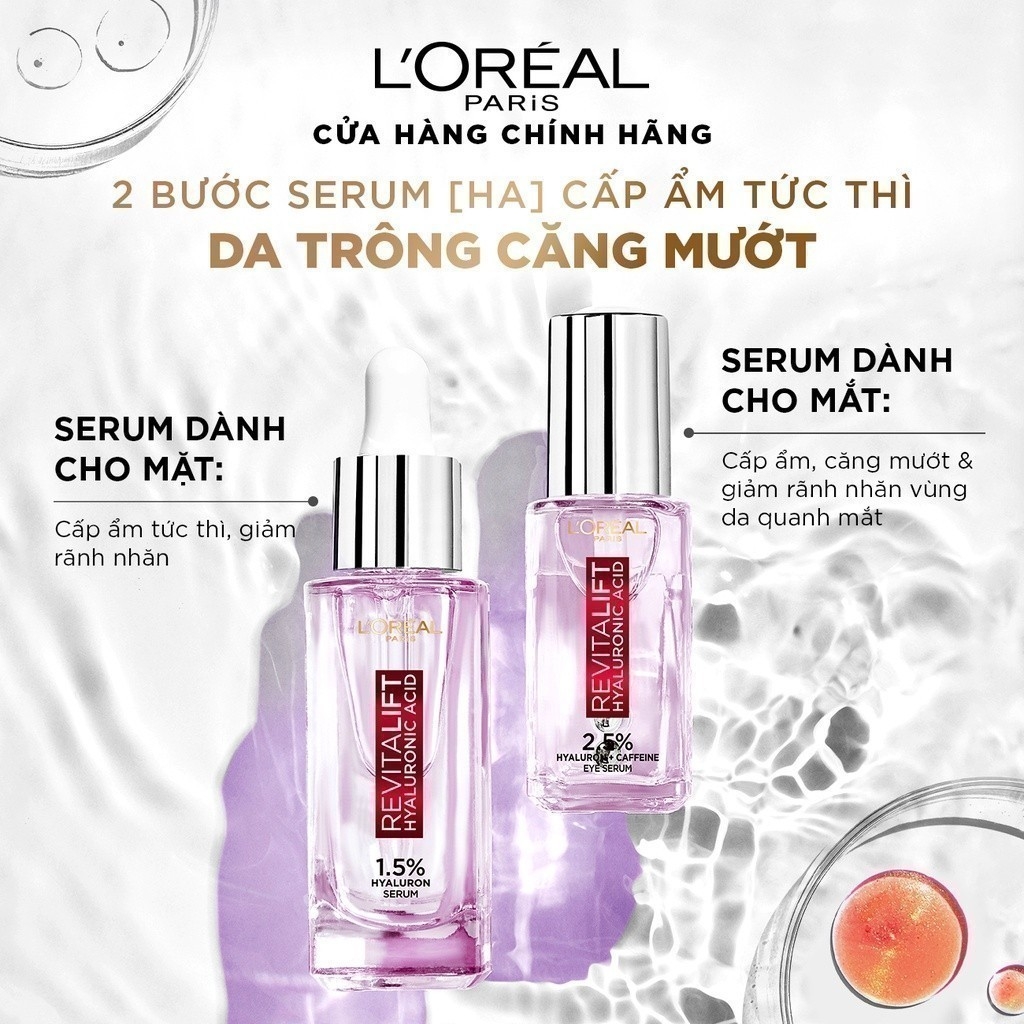 Hyaluronic Acid: Serum L'Oreal Tinh Chất Dưỡng L'Oreal Cấp Ẩm, Cải Thiện Nếp Nhăn hiện nay đã có mặt tại Thế Giới Skinfood với thành phần chủ chốt là HA (Hyaluronic Acid) có khả giữ nước gấp 600 đến 100 lần trọng lượng của mình tương đương 1gr HA có khả năng ngậm đến 6 lít nước từ đó duy trì được độ ẩm và tạo lớp màng dưỡng ẩm bảo vệ độ ẩm cho da.