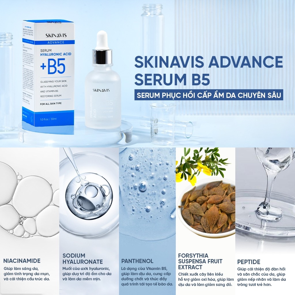 Skinavis Advance Serum B5 là serum giữ ẩm có công thức cải tiến hơn với HA đa tỷ trọng, tạo cảm giác mướt da hơn.