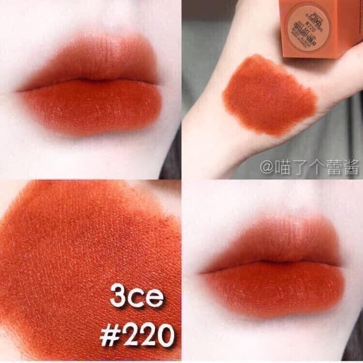 - 3CE Mood Recipe Matte Lip Color với vỏ ngoài hình vuông và phủ một lớp nhung mịn màng nên cầm trên tay rất sang trọng.