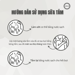 - Cách sử dụng: Làm ướt toàn thân bằng nước sạch. Lấy một lượng sữa tắm vừa đủ và tạo bọt bằng bông tắm, sau đó mát-xa nhẹ nhàng toàn thân. Tắm lại với nước sạch sau khi dùng.