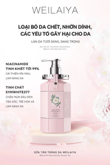 - Sữa Tắm Trắng Da Hoa Trà Weilaiya Niacinamide Shower Gel có kết cấu đậm đặc, giúp tạo nhiều bọt mịn chỉ với một lần nhấn vòi, giúp làm sạch da một cách dễ dàng và không để lại cảm giác nhờn dính trên da sau khi tắm.