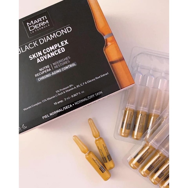 MartiDerm Black Diamond Skin Complex Advanced là phiên bản cải tiến mới của Skin Complex+, với công thức toàn diện nhất giúp đặc trị làn da lão hóa do yếu tố nội sinh. Sản phẩm là sự kết hợp của 5% Proteum 89+ (thành phần độc quyền Martiderm) giúp cung cấp độ ẩm chuyên sâu và cải thiện cấu trúc da; 25% Vitamin Complex (trong đó bao gồm 15% Vitamin C-Tech & 10% Vitamin A, B5, E, F & D-Like) giúp chống oxy hóa mạnh mẽ, làm chậm tiến trình lão hóa da, đồng thời nuôi dưỡng và phục hồi lại độ ẩm mượt, sáng mịn và tươi trẻ của làn da. Sản phẩm đặc biệt lý tưởng dành cho làn da khô mất nước, xỉn màu, có dấu hiệu chảy xệ và nếp nhăn.