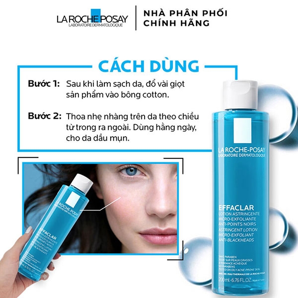 - Nước Cân Bằng Giàu Khoáng Dành Cho Da Dầu La Roche Posay Effaclar Astringent Lotion 200ml dành cho da dầu mụn, với các vi hạt giúp làm sạch và thu nhỏ lỗ chân lông, nhờ vào sự kết hợp giữa các hoạt chất giúp thanh lọc và thành phần tẩy tế bào chết LHA.