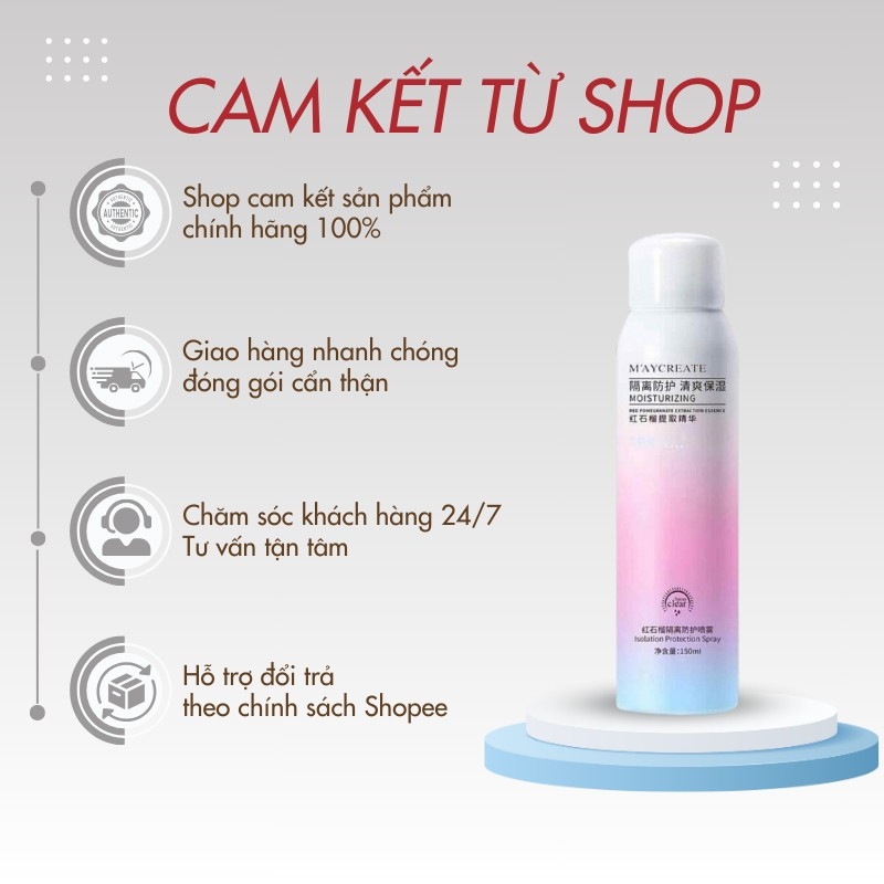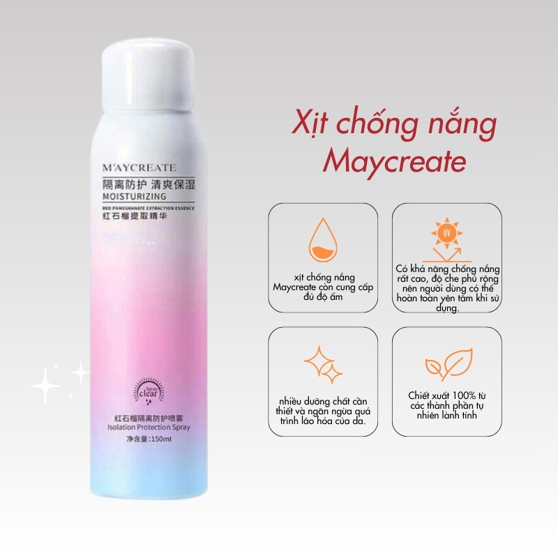 Kem chống nắng xịt body Maycreate với chỉ số SPF35 và công nghệ chống nắng phổ rộng Broad Spectrum bảo vệ da hiệu quả khỏi tia UVA và UVB, giúp làm trắng da và ngăn ngừa tổn thương do ánh nắng. Dạng xịt phun sương nhẹ nhàng, dễ thẩm thấu vào da, không bết dính, không làm tắc lỗ chân lông. Sản phẩm có khả năng chống nước, lý tưởng cho những ngày hè nóng bức hay khi bạn đi bơi.