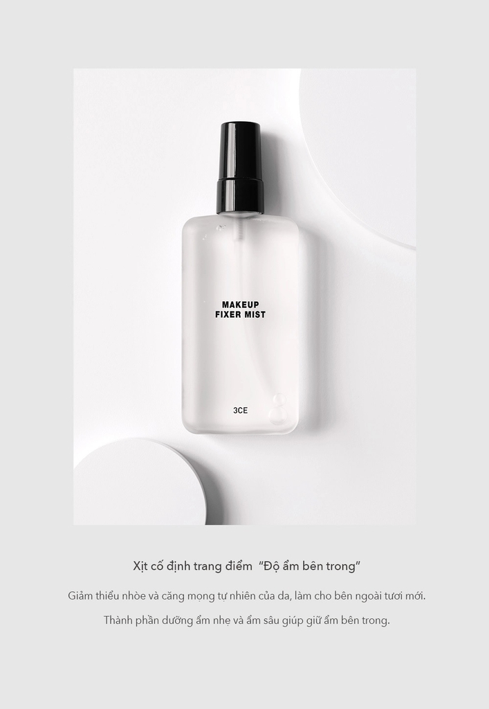 Dùng Xịt Khóa Nền 3CE Makeup Fixer như bước cuối cùng sau khi hoàn thành lớp makeup theo các bước sau: